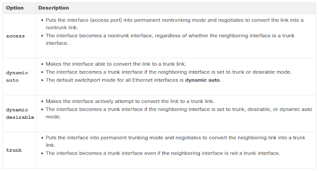 Switch(config-if)# switchport mode { access | dynamic { auto | desirable } | trunk }The options are described in the table.